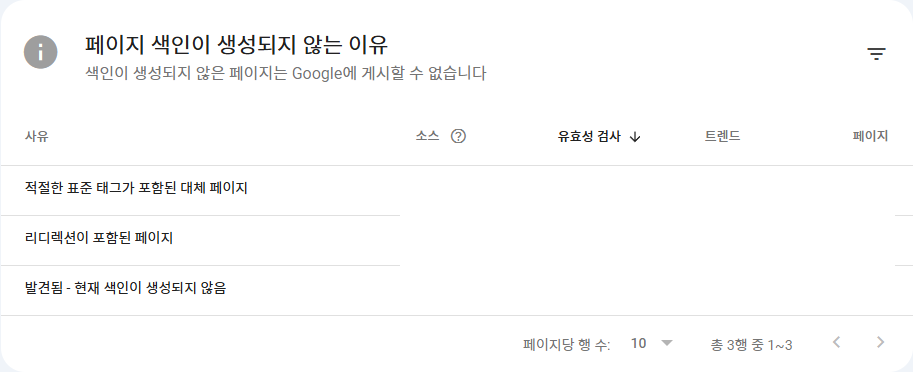 이 페이지의 하단에는 각 링크별 색인오류가 발생한 이유와